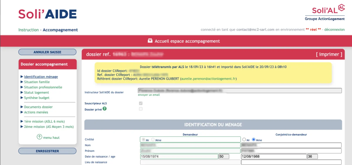 > avec le Contrôle de Gestion Action Logement (remontée automatique des données de reporting) - espace métier de suivi de mission d’accompagnement dédié aux conseillers sociaux et intégré à l’espace d’instuction